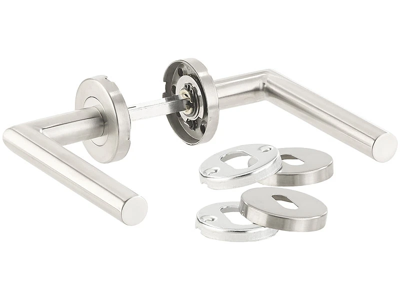 - 2er-Set Türbeschläge inklusive je 2 Türklinken, 2 Klinken-Klipp-Rosetten, Vierkant-Stift, 2 Profilzylinder-Rosetten, 2 Buntbart-Klipp-Rosetten, Montage-Material und deutscher Anleitung