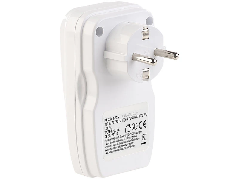 - Stromversorgung Steckdose: 230 Volt, Fernbedienung: 1 Batterie Typ CR2032 (Knopfzelle)