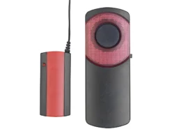 - Klingel-Einheit mit Signal-LED, Befestigungs-Clip (z.B. für Gürtel oder Hosentasche) und Schiebe-Schalter: Alarm/Klingel/aus