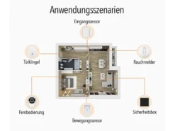 - Automatische Szenen-Funktionen programmierbar, z.B. zum Schalten mehrerer Geräte gleichzeitig, zum Einschalten von Licht bei Alarm u.v.m.