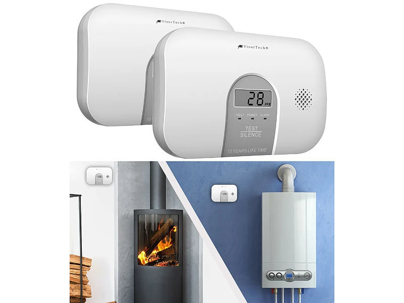 - Ständige Messung des CO-Gehalts in der Raumluft, warnt vor giftigem CO