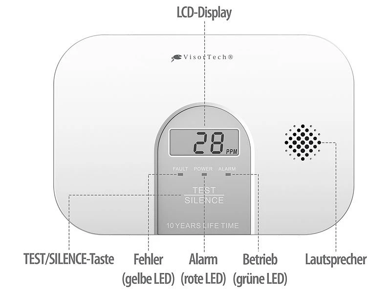Auf dem übersichtlichen LCD-Display sehen Sie auf einen Blick die aktuelle CO-Konzentration sowie die Raumtemperatur und den Batteriestand. Für zusätzliche Sicherheit sorgen die Selbsttest-Taste, 3 Status-LEDs sowie die akustische Warnung bei schwacher Batterie.